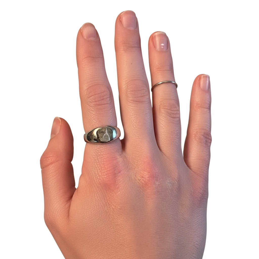 L‘anello è pensato per custodire ciò che ami davvero,puo essere inciso con un nome, una data o una parola del cuore… e anche con una foto, per portare sempre con te un ricordo speciale.