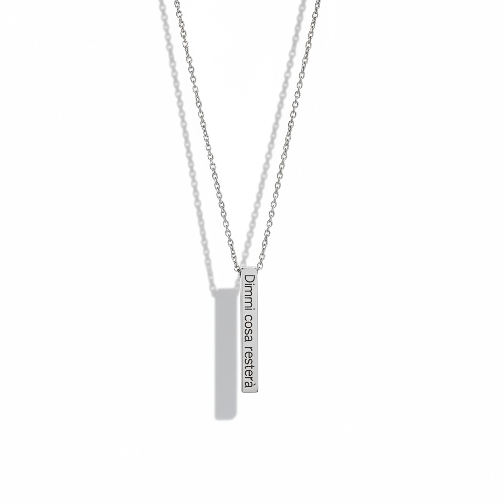 Collana minimal con pendente a barra verticale incisa, dal design elegante e moderno. Realizzata in acciaio inossidabile 316L ipoallergenico, resistente all’acqua e pensata per durare nel tempo senza perdere brillantezza. Perfetta da personalizzare con una frase, una data o un nome speciale, per trasformarla in un gioiello unico e carico di significato. Ideale da indossare ogni giorno o da regalare come ricordo prezioso.