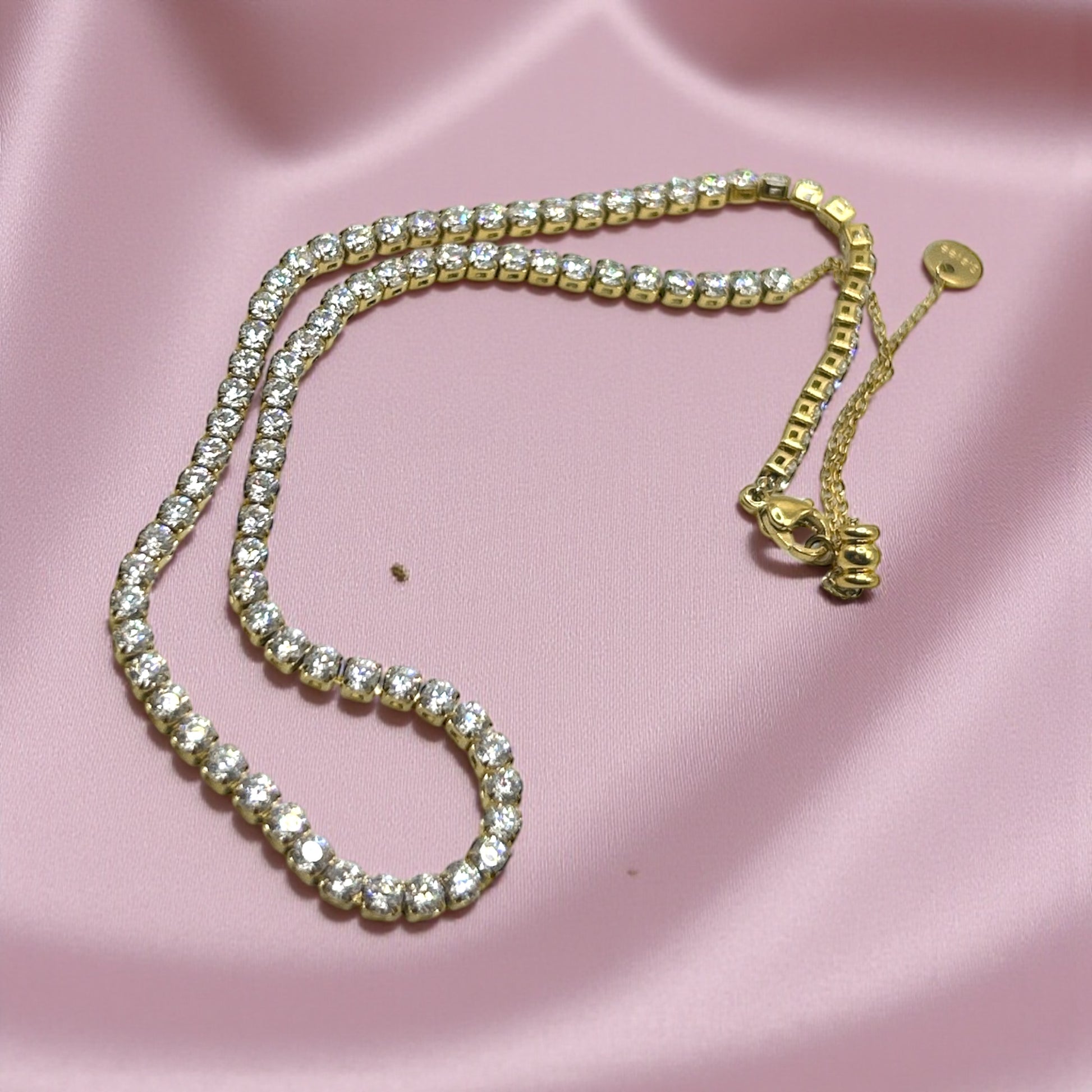 La Collana Tennis da 3mm Nastea è realizzata in acciaio 316L con zirconi luminosi e un cursore regolabile che ti permette di scegliere la lunghezza perfetta — da indossare come collana elegante o choker raffinato.