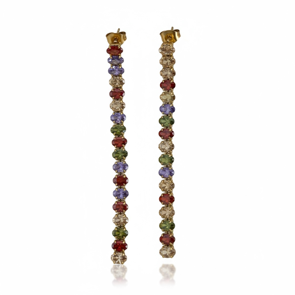 Orecchini luminosi e colorati, ispirati a Iris, simbolo di luce e armonia. La linea verticale di zirconi multicolore dona un effetto elegante ma vivace, perfetto per illuminare il viso e dare carattere a qualsiasi look.