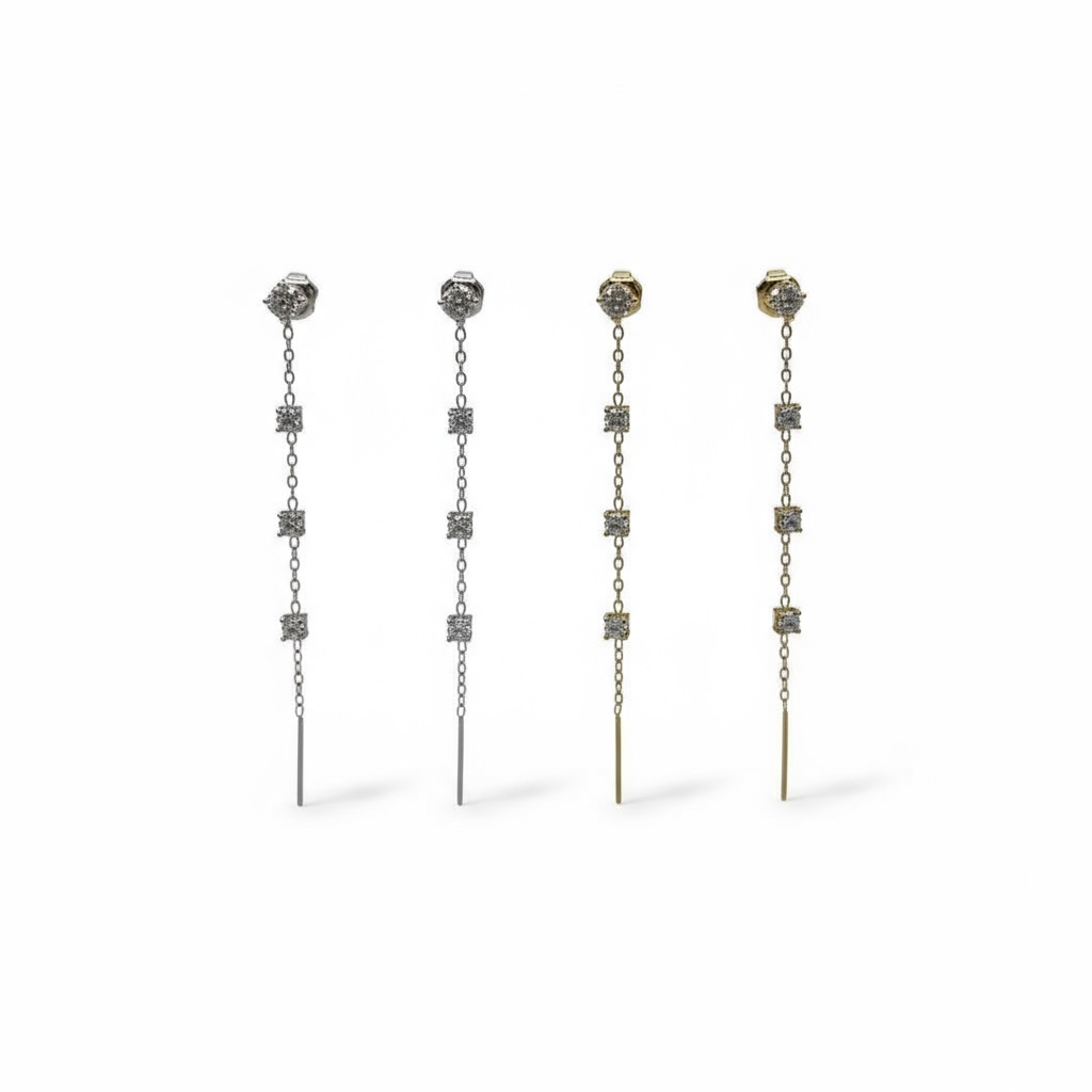 Una cascata di zirconi luminosi scende con eleganza, creando un effetto raffinato e seducente che incornicia il viso con estrema leggerezza.