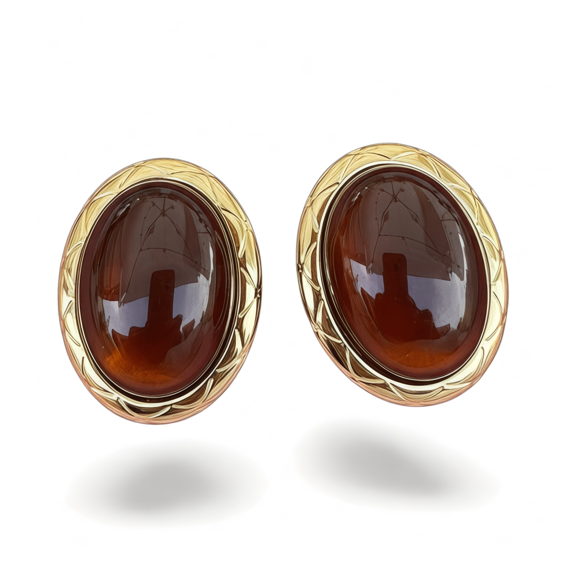 Il design ovale, incorniciato da una montatura lucida e intagliata, valorizza la pietra effetto ambra al centro, creando un gioco di riflessi caldi e avvolgenti.